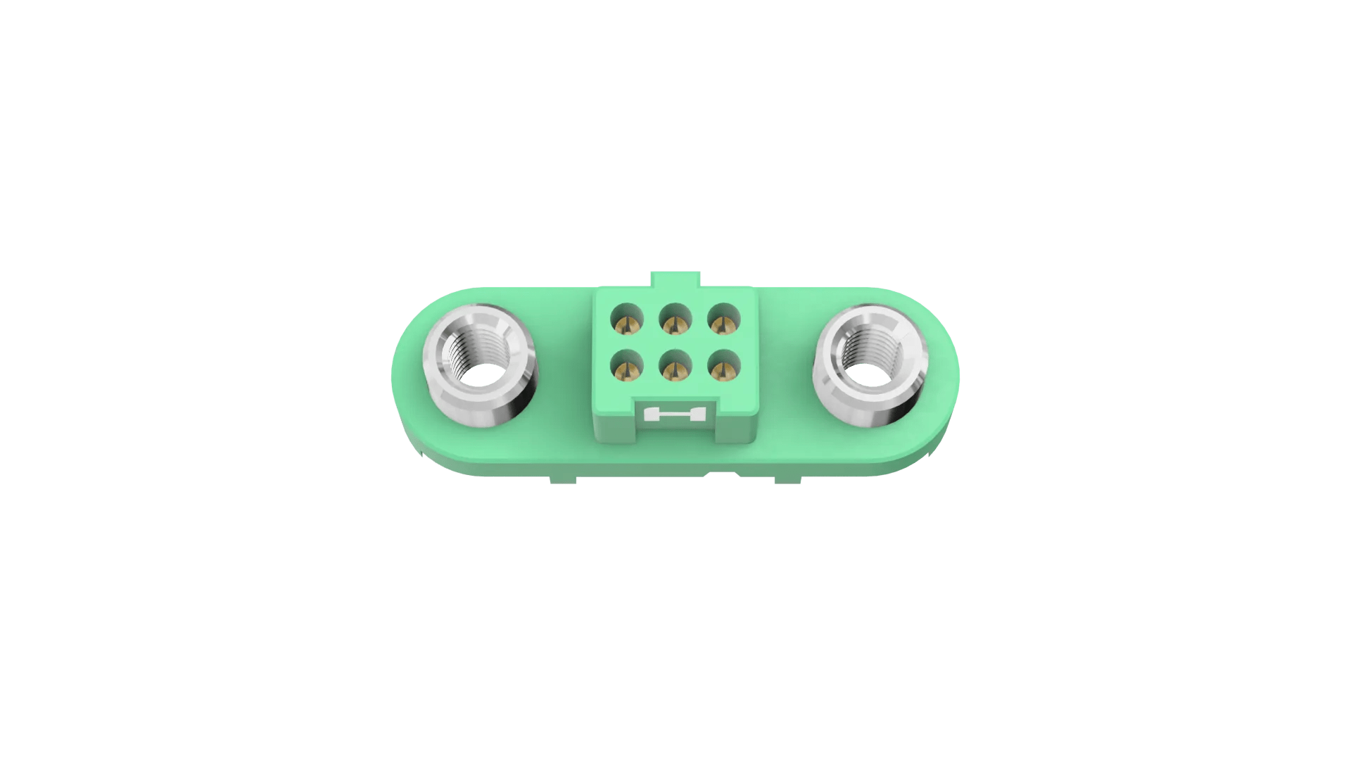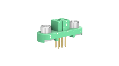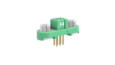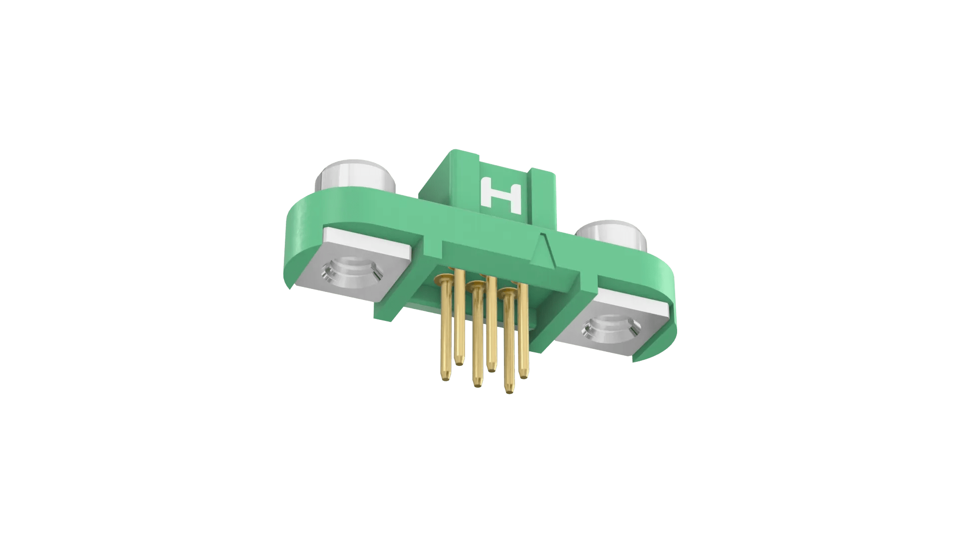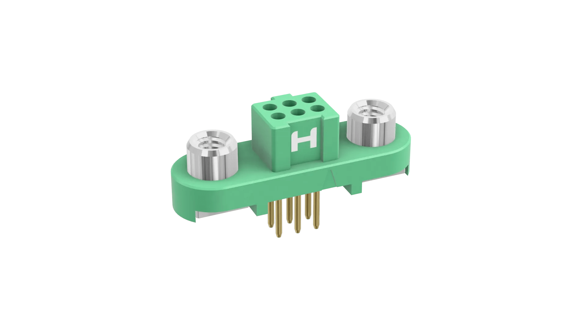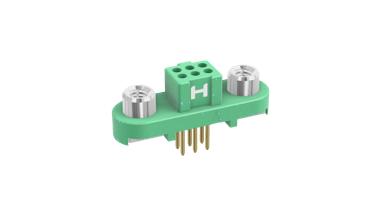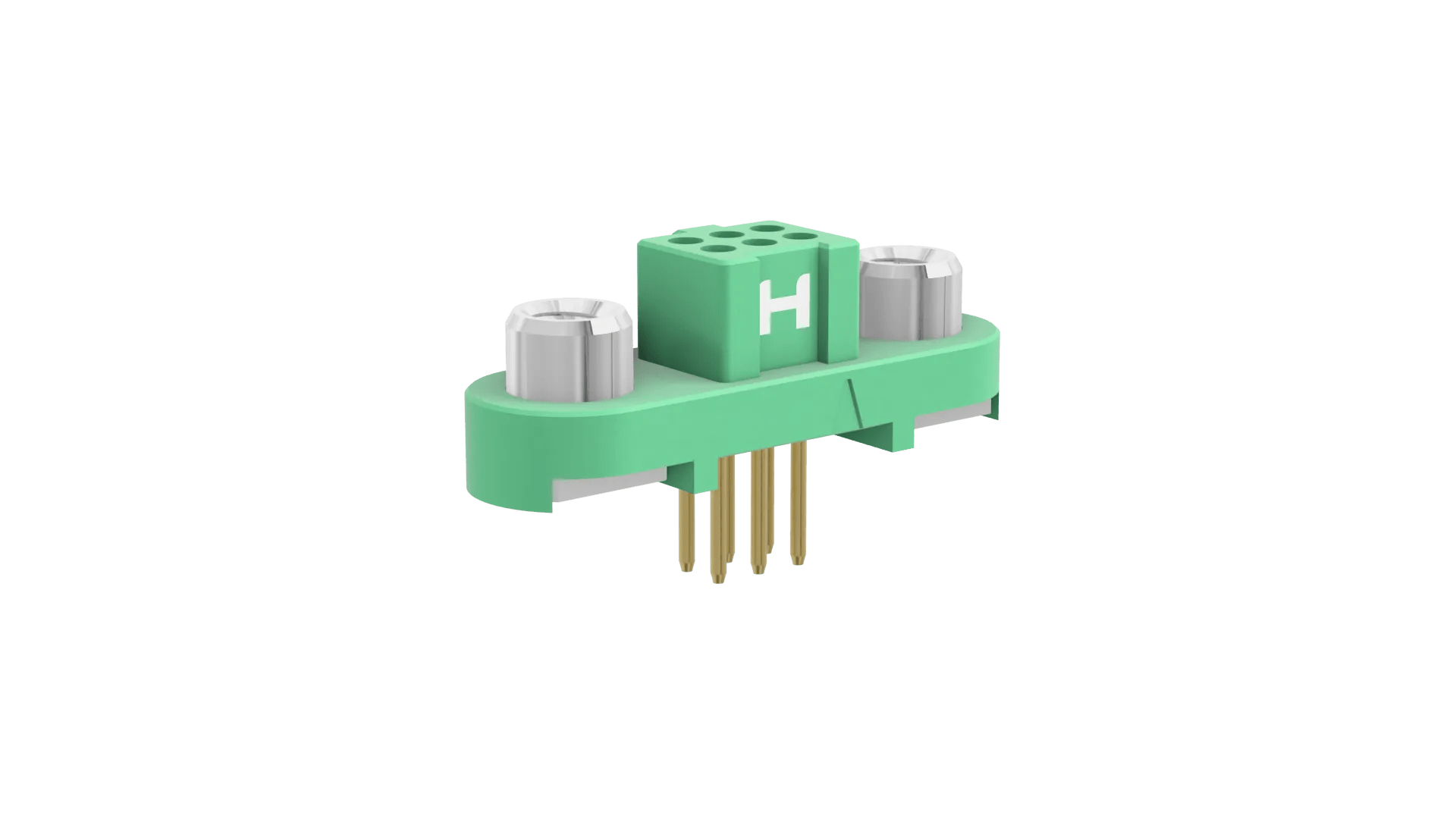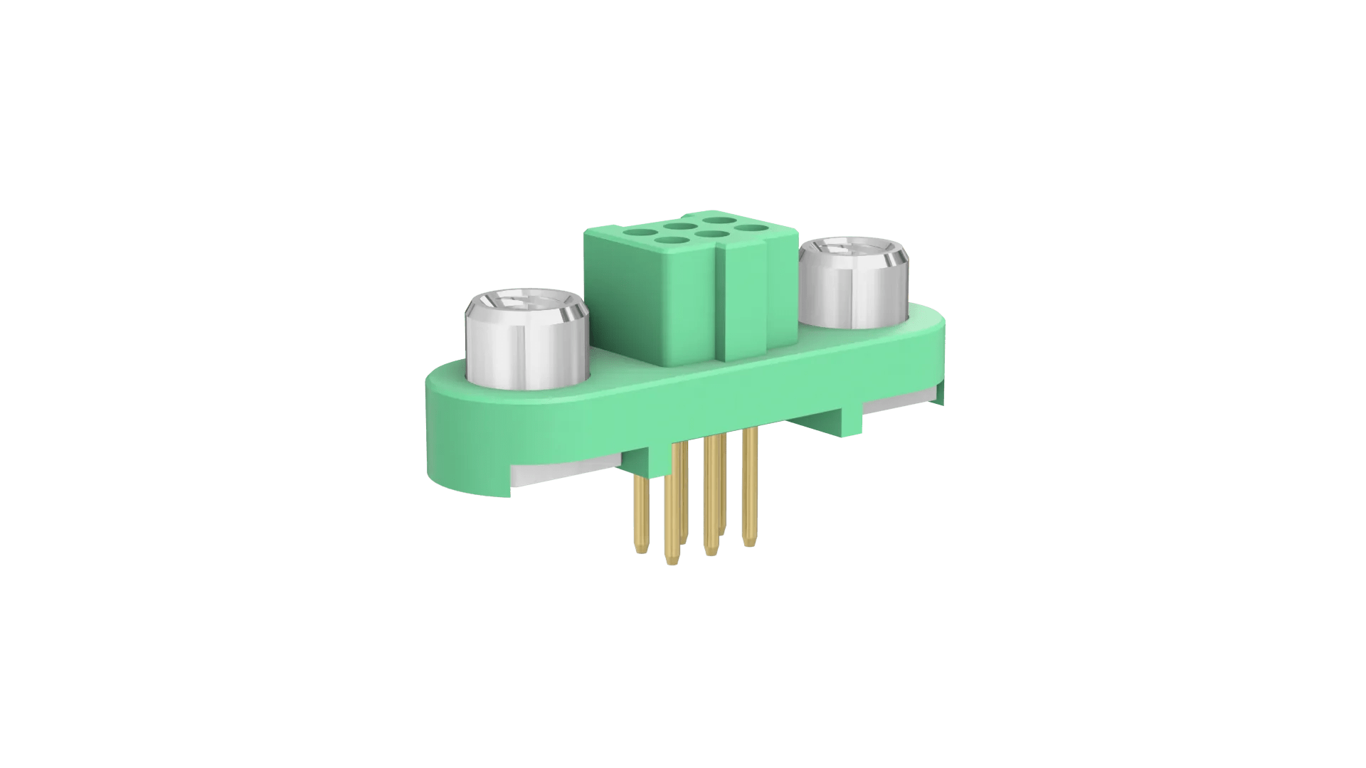 Female Double Row Vertical 3mm PC Tail connector - 6 contacts (3+3). Fitted with internally threaded Screw-Loks, for reverse fixing.