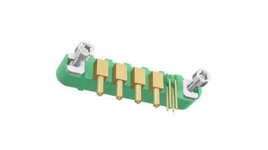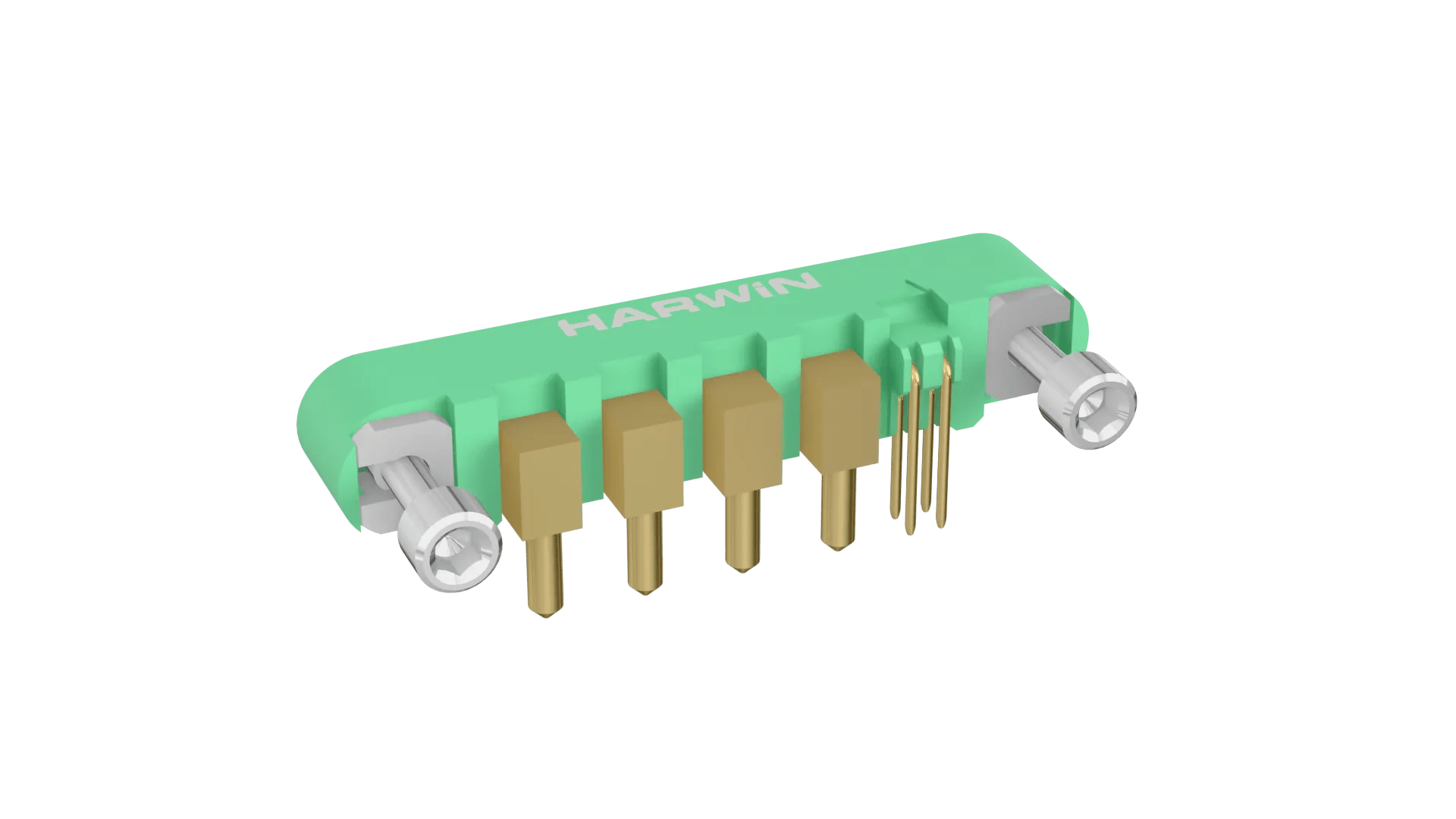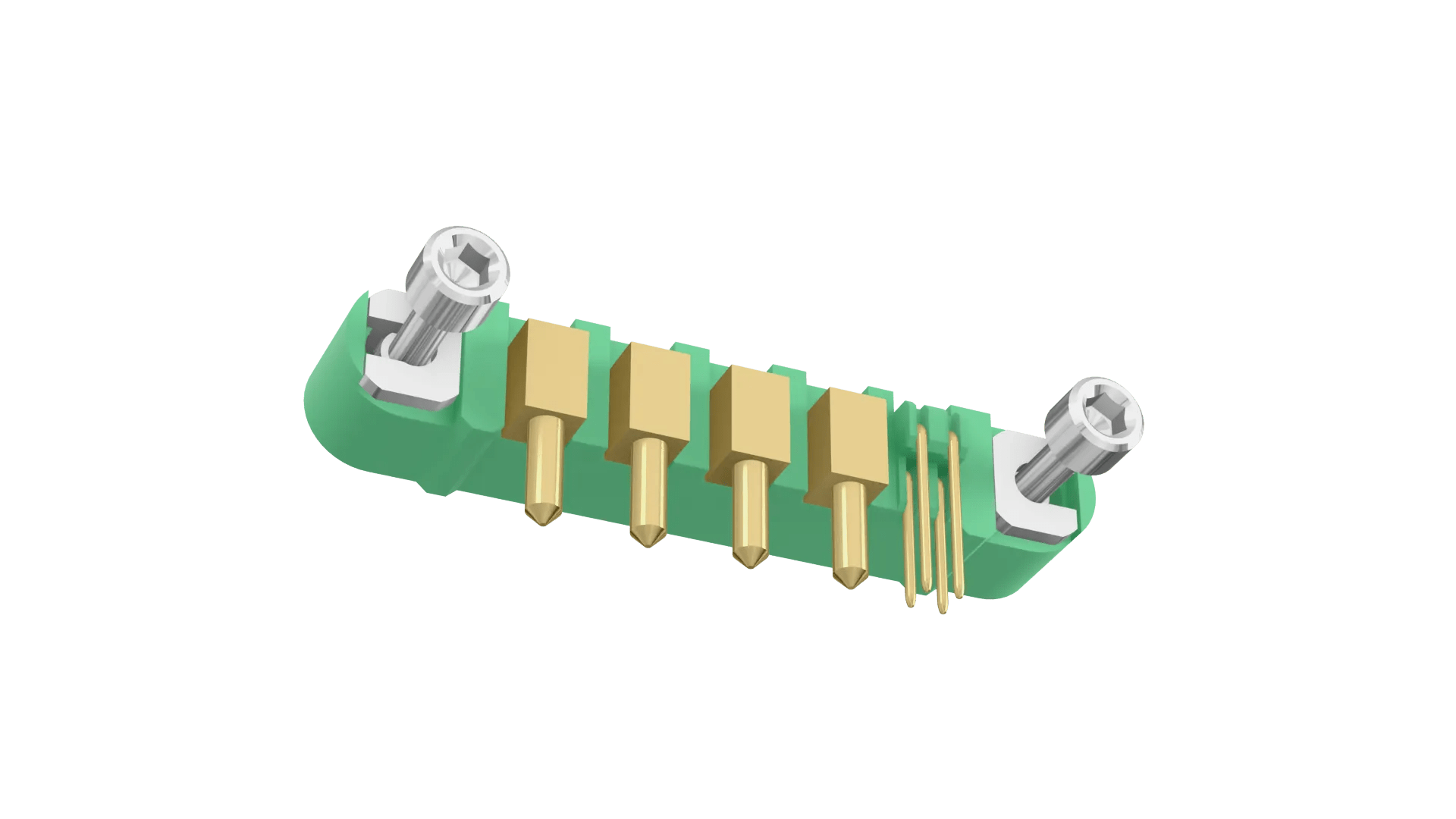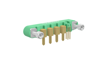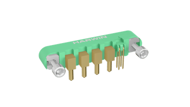 Male Horizontal Throughboard connector - 4 power, 4 signal contact arrangement. Power contacts are 3.5mm termination length, signal are 3.3mm. Fitted with floating Screw-Loks for reverse fixing including a hexagonal socket head, Mate-before-Lock.