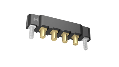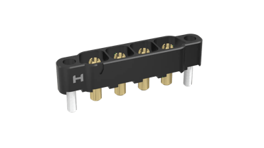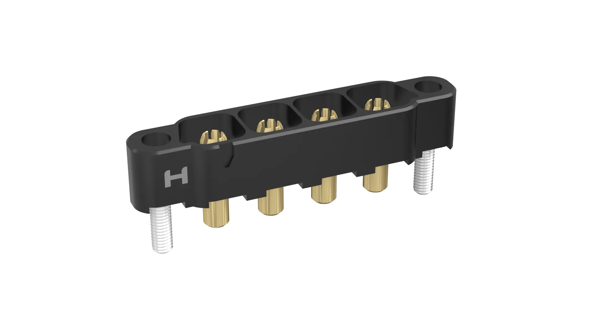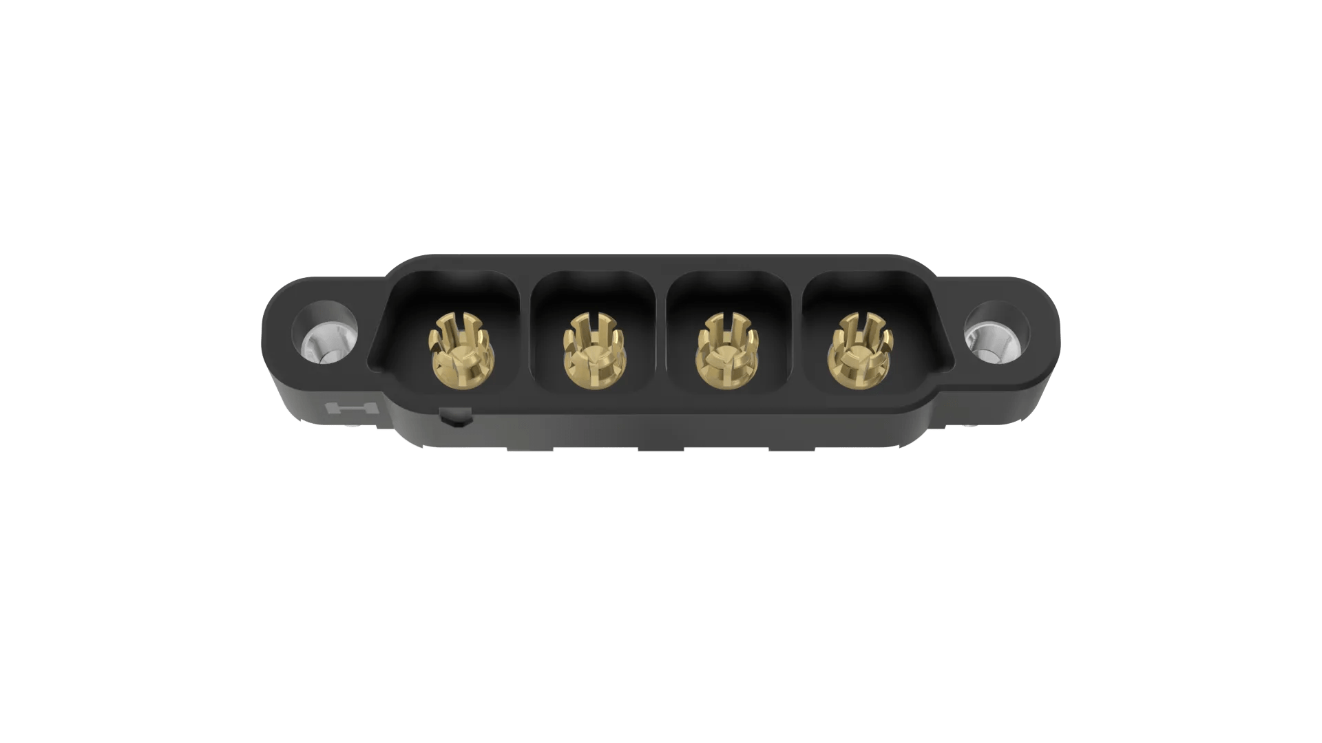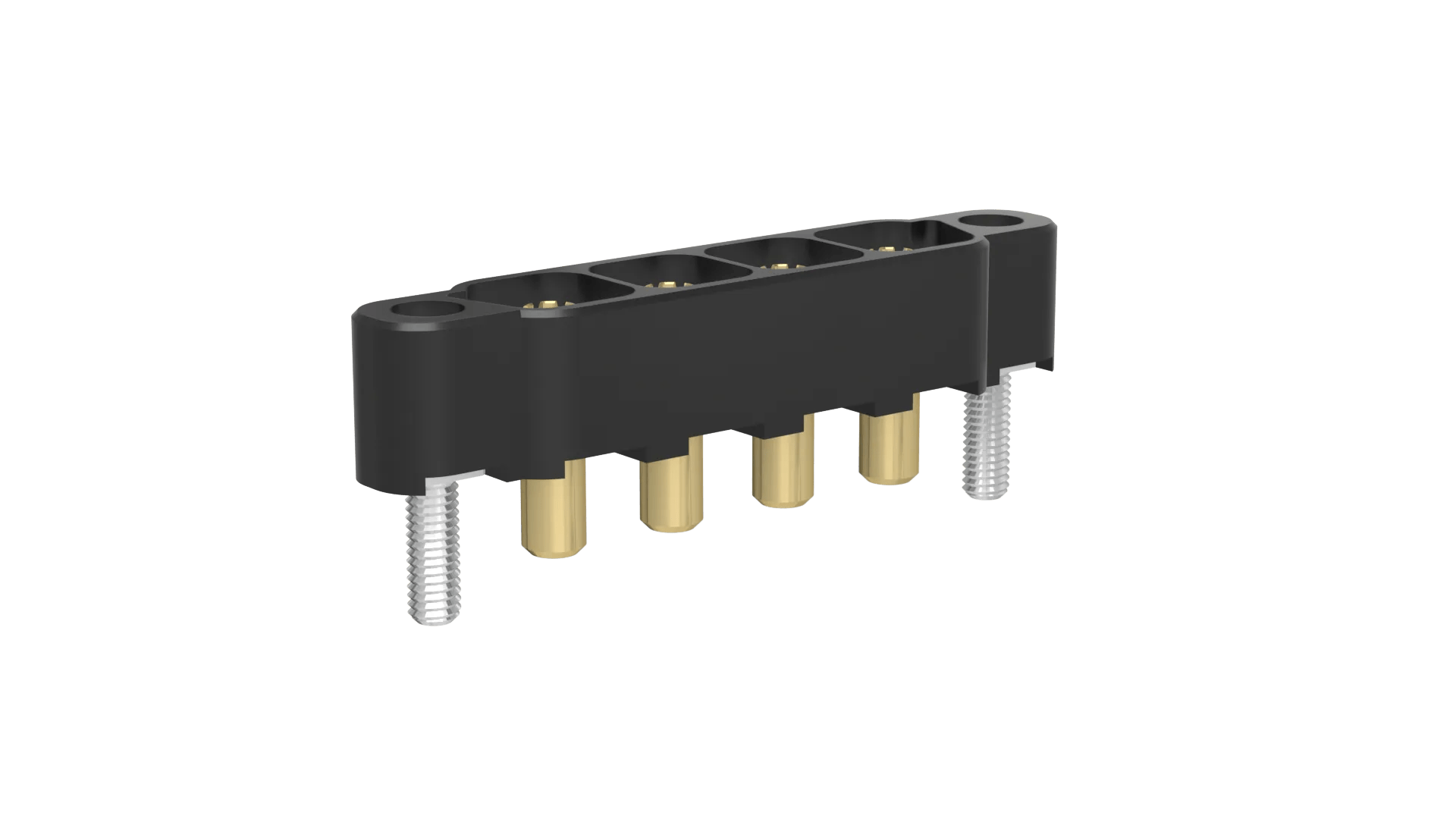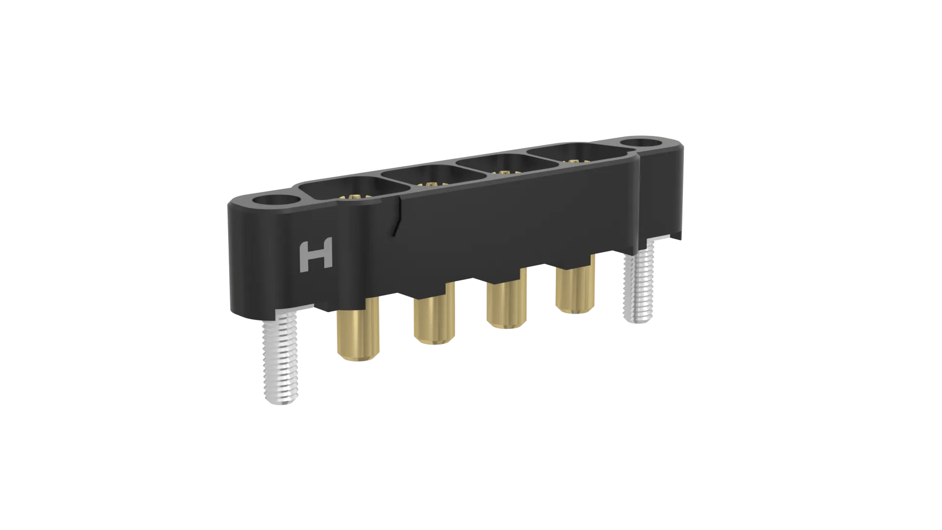 Male plug Single Row straight (vertical) connector, throughboard 5.9mm PCB terminations - 4 contacts. Fitted with threaded screw fixings and 8.6mm board mount studs. Use slotted nut KA1-4240000 for board mount retention.