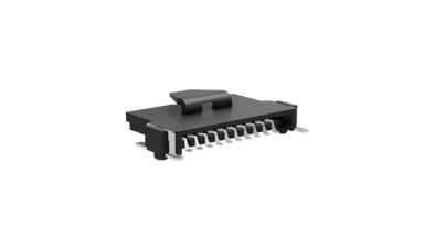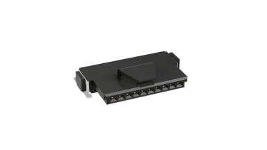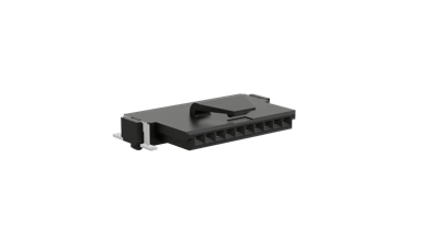 Single Row Surface Mount, shrouded and polarized connector - 10 contacts. Location pegs, surface mount hold-down retaining tabs for additional solder strength. Latching mechanism for additional mating retention.