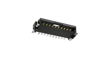 Single Row Surface Mount, shrouded and polarized connector - 10 contacts. Location pegs, surface mount hold-down retaining tabs for additional solder strength. Latching window for additional mating retention.