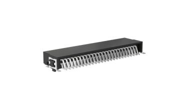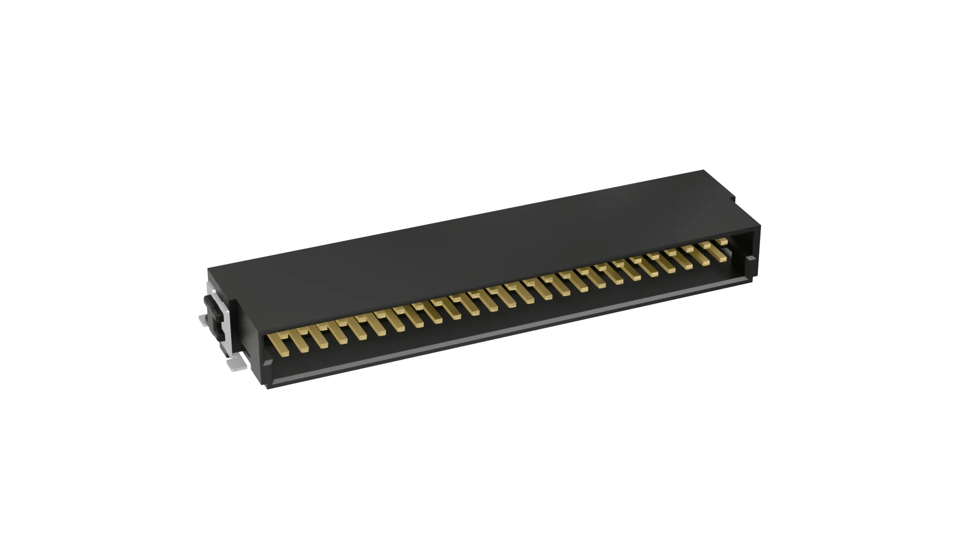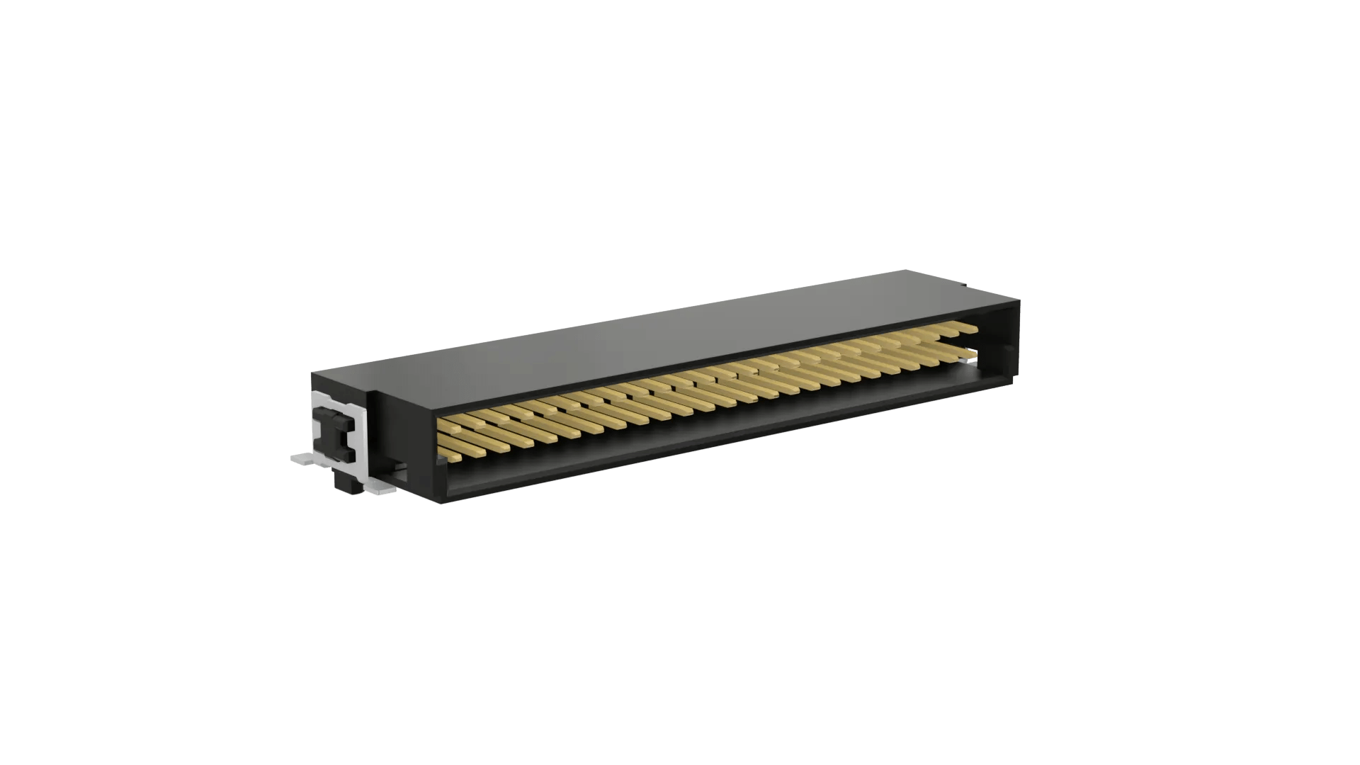 Double Row Surface Mount, 10mm total footprint depth, shrouded polarized connector - 50 contacts (25+25). Location pegs, surface mount hold-down retaining tabs for additional solder strength.