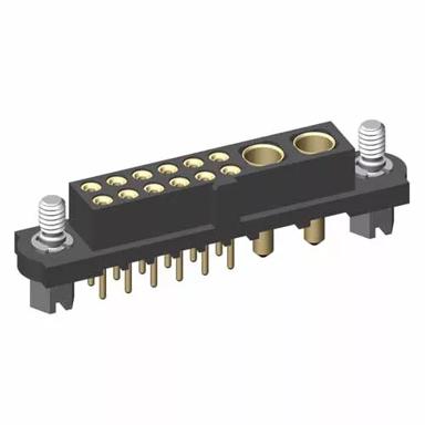 Hexagonal slotted jackscrews, 12 x signal and 2 x power contacts assembled for vertical PCB connection. 3mm length PC Tail signal contacts, 3.5mm length PC Tail power contacts.