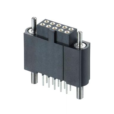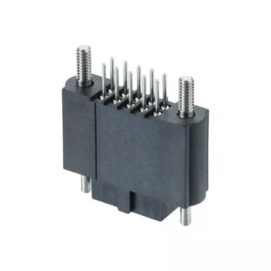 Double Row, 4.4mm PC Tail extended height connector with Guide pin + 5mm board mount studs - 10 contacts (5+5). Board-to-board height is 17.15mm when mated to a male vertical throughboard connector.